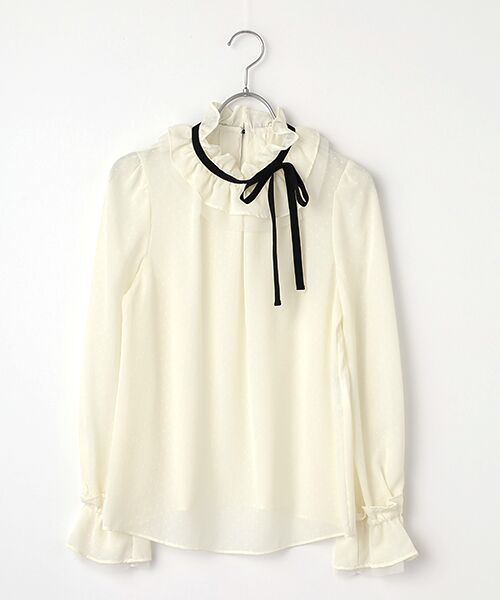 ドットフロッキーでさりげなく着映える♡■デザインシアーな素材感とフリル多めのデザインがフェミニンな印象です。衿元のリボンが上品見えするポイント。お袖に少しボリュームを持たせて、さらに切り替えた袖口はふんわりと広がる優しいイメージです。■スタイリング素材の透け感を活かした軽やかなスタイリングがオススメ。季節が進めばカーディガン合わせもGOOD◎スカートと合わせて綺麗めスタイルでも、デニムとのカジュアルスタイルでもOK。■素材繊細なシアーをベースに、やや小ぶりなドット模様をカットジャガードで表現しました。透け感のある薄手の素材です。