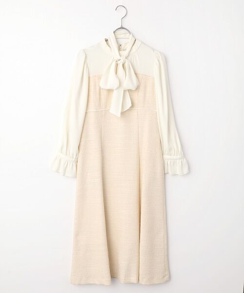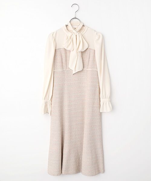 1枚でコーデが完成♡ドッキングワンピ■デザイン上品さと可愛さを兼ね備えたレイヤード風デザイン。サテン素材のフロントリボンが顔周りを華かな印象に。マーメイドシルエットが清楚なイメージを演出します。■スタイリング同素材のジャケット(3057302)とのセットアップがおすすめ。ツイード素材で気品高くエレガントなスタイルになります。■素材優しい配色のカラーツイード生地です。ややストレッチ性があり中肉厚の軽やかな素材です。