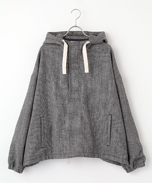 ギンガムウールを使用し、雰囲気の良いANORAKに仕上げました。フードと裾にはコードを通しお好きなアレンジで着用してください。