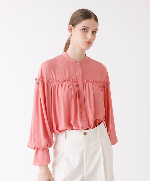 強撚糸と割繊糸を織り交ぜたジョーゼット素材。膨らみと艶、柔らかいドレープ感のある独特なタッチの素材です。身頃から袖にかけて切り替えたギャザーが華やかなブラウス。ボトムはワイドパンツやデニムとのスタイリングがおすすめです。