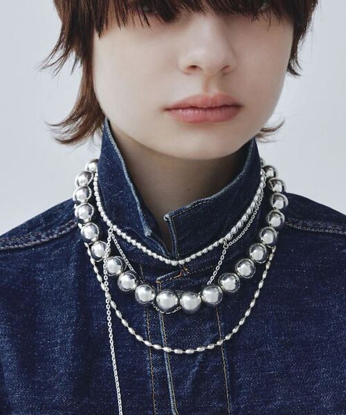 モノトーンに合わせた、モード・スタイルがおすすめ。デニムやカジュアルにも幅広くマッチするネックレスです。