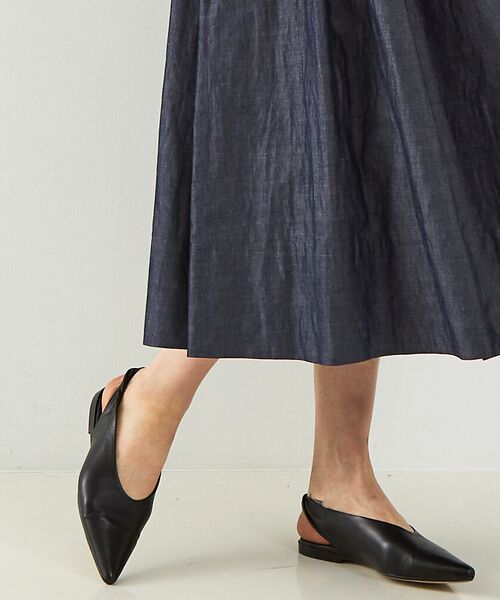 ポインテッドトゥがシャープな、バックストラップのフラットシューズ。