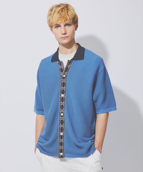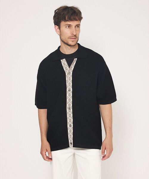 ややゆったりとしたサイズ感の半袖ニットカーディガン。3種類の透かし編みパターンを採用し、独特なタッチの表面がオリジナリティ溢れるデザインです。胸元に切り替え風の編み地を入れることでシャツのヨークを再現しており、編み地のコントラストが際立ちます。