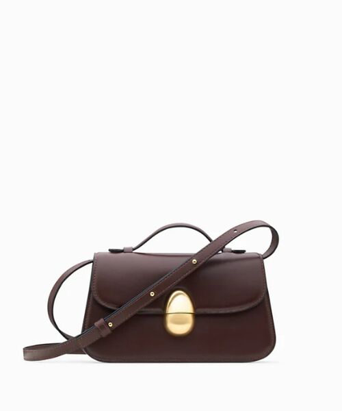 トラペーズ型のシルエットが印象的な、コンパクトなレザーバッグです。