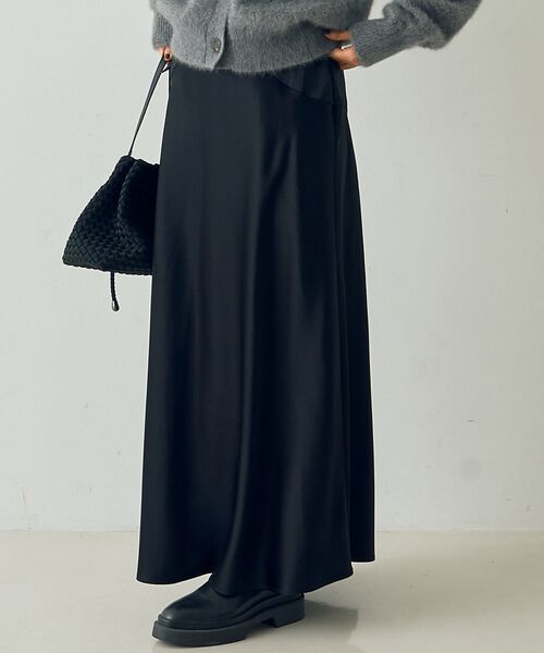 上品な光沢感が魅力のサテン生地で仕立てたセミフレアスカート。