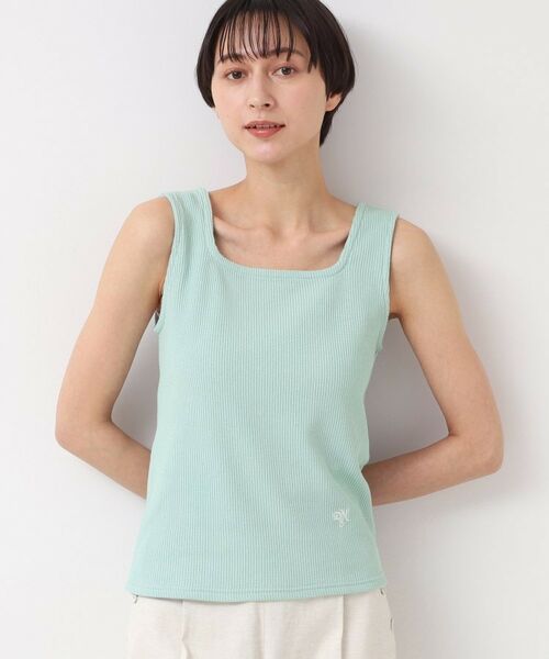 クルーネックのタンクトップとは違った印象のレイヤリングスタイルが完成されます。