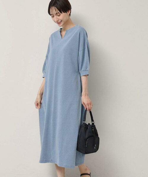 ゆったりとした身幅ですが、キーネックと、キュっとしまった袖口デザイン、裾のスリット等により、すっきり見えするワンピースです。