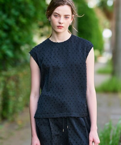 バックスタイルのアシンメトリーな明きをポイントにしながら、立体的なジャカード生地の魅力を活かしてシンプルなシェルトップに仕上げました。