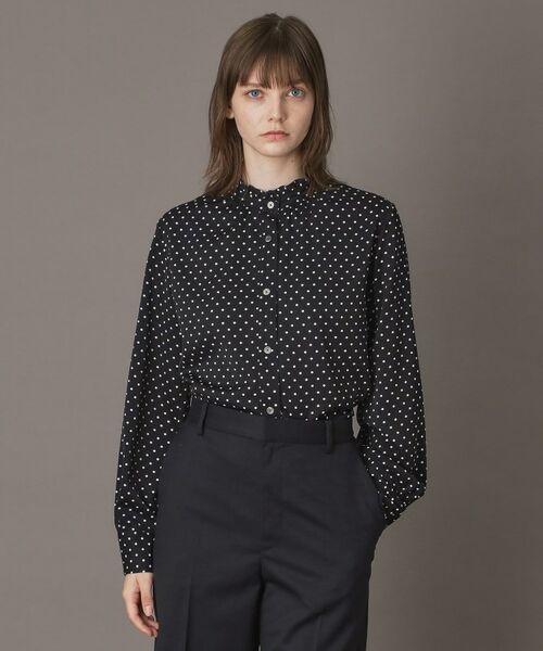 【衿元のフリルが華やかなドット柄スタンドフリルシャツ】