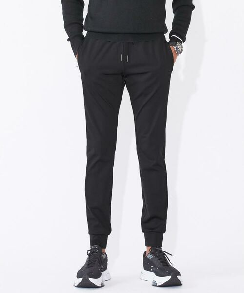 程よい艶感があり、スポーティな印象のジョガーパンツに都会的で上品な雰囲気をプラス。