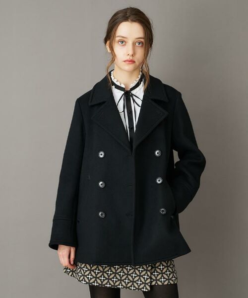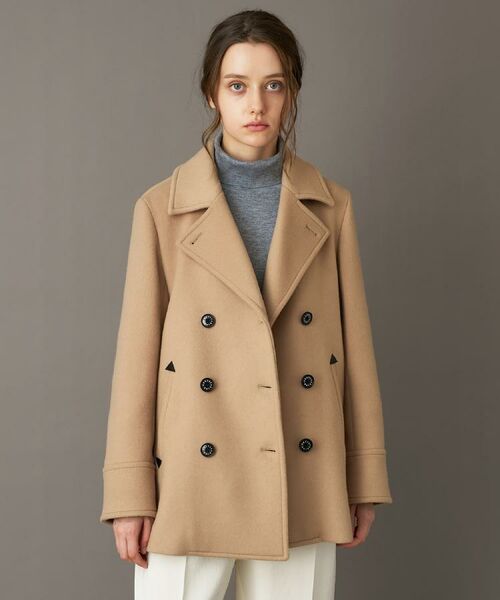 コンパクトな肩まわりから裾に向けて広がるAラインが女性らしく、ヒップの隠れる着丈で正統派な印象を持つミドル丈Pコートです。