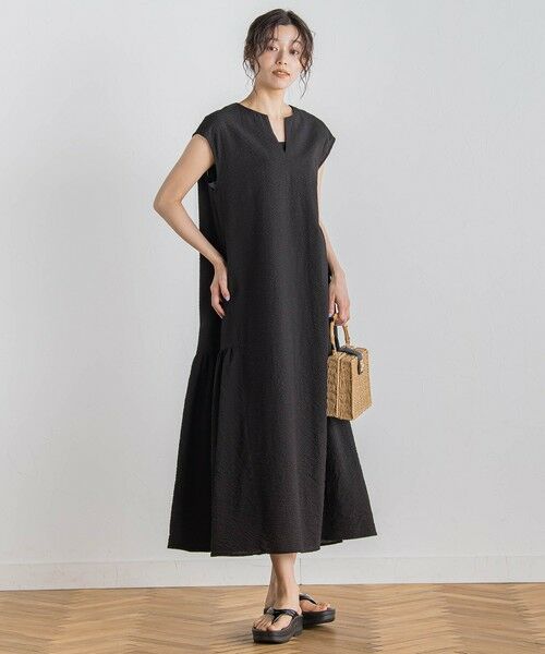 凹凸のあるサッカー素材の表情が清涼感のあるワンピース。