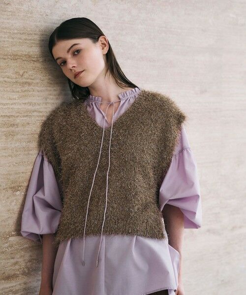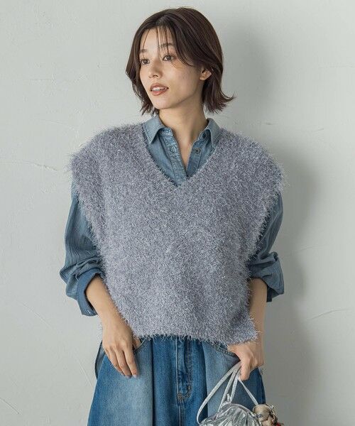 ニュアンスカラーのフェザーにラメミックスの表情が華やかさをプラスしてくれる今年らしいニットベスト。