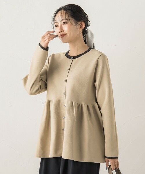 ペプラムシルエットにバイカラーのラメネックが旬なムードのカーディガン。