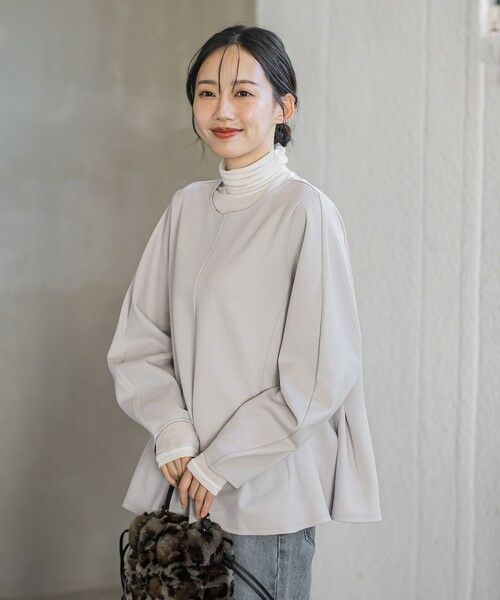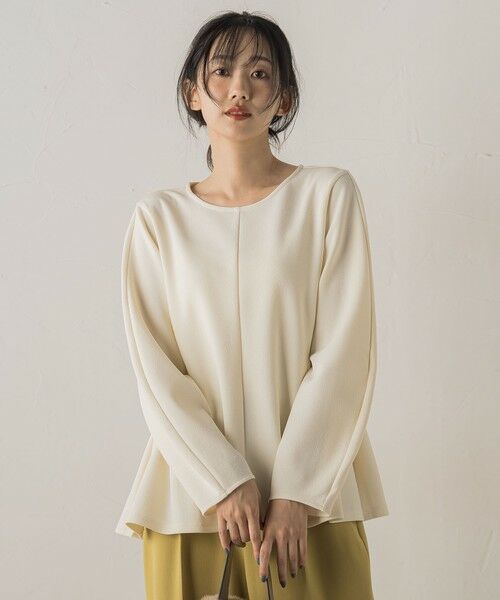 脇からの斜めのタックで表現したペプラムシルエットがポイントで、可愛らしくなりすぎず1枚でも着映えが叶います。