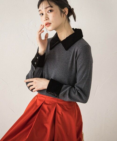 衿とカフスに光沢感のあるベロア素材を使用したエレガントで女性らしい雰囲気のある秋らしさ満点のニット。