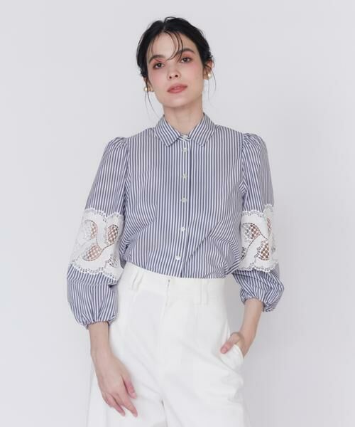 すっきりとした白×ブルーのストライプ柄と、レースドッキングが特徴的なブラウス。ノンステッチ仕様で、小さめの衿と貝ボタンが上品さとクラシックな魅力を引き立てます。袖にはオリジナルの柄でデザインされたレースを切り替えて、程よく透け感を持たせることで、クチュール感あふれる仕上がりに。袖口はゴムギャザー仕上げで、ボリューム感があり、袖をまくって着ることも可能。伸縮性に優れたストレッチシャツ生地を使用しており、着心地が良く、動きやすさも抜群です。爽やかな白×ブルーのストライプ柄が印象的で、シーズン問わず活躍するアイテムです。