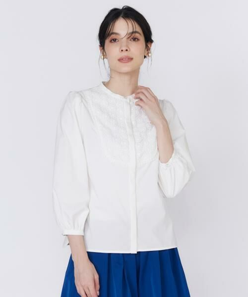 小花柄の上品で華やかなオリジナルレースと大きめなピコレースをドッキングさせたこだわりのブラウス。小さめのスタンドカラーが凛とした品を持ち、モダンな雰囲気を演出します。肌触りがなめらかで、まるでシルクのような光沢を持つポリエステル素材を使用。伸縮性も抜群なので、体の動きにぴったりとフィットし、楽な着心地です。モチーフが立体に仕上がるよう、花の中心部分と花弁で刺繍を変えています。ピコレースも柄が立体的に見えるよう、フリル中心部と端とで刺繍を変え、フリル柄の立体感が花柄レースとマッチしています。ジャケットのインナーにも一枚で映えるデザインで、オフィススタイルにもおすすめです。