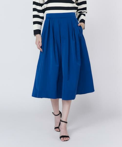 ウエストから裾にかけて流れるようなランダムタックが特徴のフレアスカートです。動くたびに揺れるプリーツが女性らしい優雅さを演出します。後ろ中心のゴムギャザーが快適なフィット感を生み出し、着脱もスムーズ。ウエストベルトには特別にデザインされたボールチェーン風の金属ファスナーがあしらわれ、リュクスなアクセントを添えています。形状記憶加工を施した、柔らかくドレープ性の高い高品質なポリエステル素材を使用。通常のメモリー素材に比べてハリと擦れる音を最小限に抑えました。発色の良い鮮やかなブルーがコーディネートの主役を飾ります。