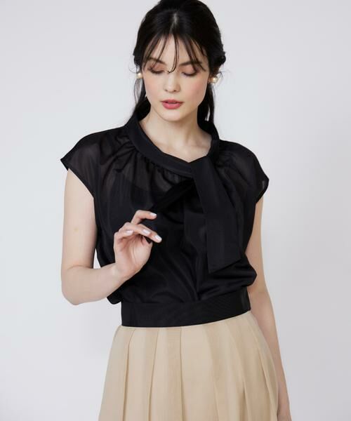 アシンメトリーの衿デザインが特徴的で、着こなしの楽しさが広がるボウタイブラウス。フレンチスリーブが二の腕をカバーしてくれ、やや長めの着丈感でヒップラインも自然にカバーできます。ボトムにインしてもアウトしても美しく決まる、程よいフレアシルエットの裾がポイント。デニムとも相性抜群で、カジュアルになりすぎず上品に着こなせます。通勤からちょっとしたお呼ばれシーンまで、幅広いシーンで活躍するアイテムです。