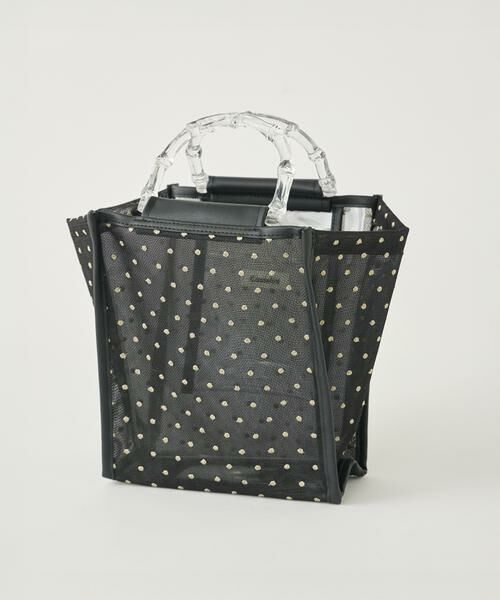 夏らしさを感じられるクリアハンドルや、チュール素材を使用した夏にピッタリのハンドバック。本体のチュールにはラメ糸を使用したドット模様が刺繍してあり、キラキラしたデザインが魅力。ペットボトルを入れられるサイズ感で、内ポケット付きで細かなものも収納可能です。