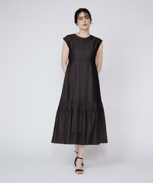これからの季節にぴったりの、柔らかな透け感と繊細な凹凸のある素材を使用したワンピース。華やかなラベンダーとシックなブラックの2色展開で、フェミニンさとモードな雰囲気を兼ね備えた一枚です。肩からウエストにかけてはバックゴム仕様で、程よくシェイプされたシルエットが魅力。オフショルダー気味のデザインで、腕まわりをさりげなくカバーしつつ、抜け感のあるスタイルを演出します。スカート部分はティアードデザインで、ふんわりとした動きのあるシルエットが特徴。リラックス感のある着心地ながら、上品な印象を与えてくれます。