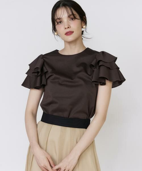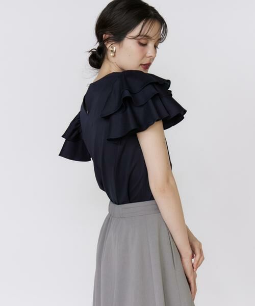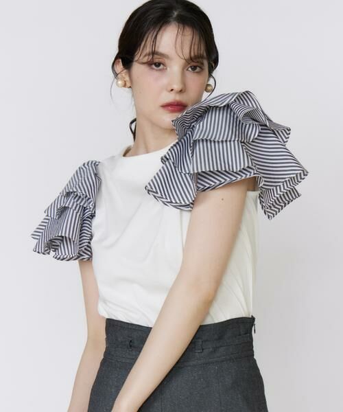 大胆なボリューム感のあるフリル袖が、腕を華奢に見せつつ、女性らしい優雅さを引き立てるカットソーです。肩幅が広く見えないよう、袖は少し内側に取り付けられており、フリルのボリューム感とシルエットの美しさにこだわった仕立てとなっています。オフホワイトのカラーには、ボーダー柄の布帛素材を使用し、より華やかな印象を与えています。コンパクトなサイズ感で、スカートにもインしやすく、コーディネートの幅が広がります。