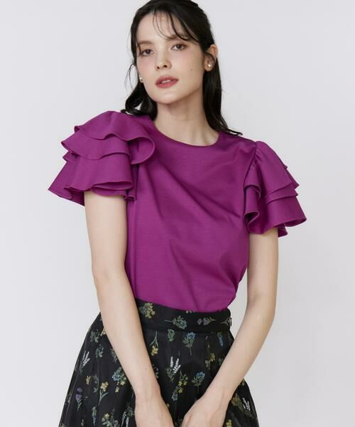 大胆なボリューム感のあるフリル袖が、腕を華奢に見せつつ、女性らしい優雅さを引き立てるカットソーです。肩幅が広く見えないよう、袖は少し内側に取り付けられており、フリルのボリューム感とシルエットの美しさにこだわった仕立てとなっています。オフホワイトのカラーには、ボーダー柄の布帛素材を使用し、より華やかな印象を与えています。コンパクトなサイズ感で、スカートにもインしやすく、コーディネートの幅が広がります。
