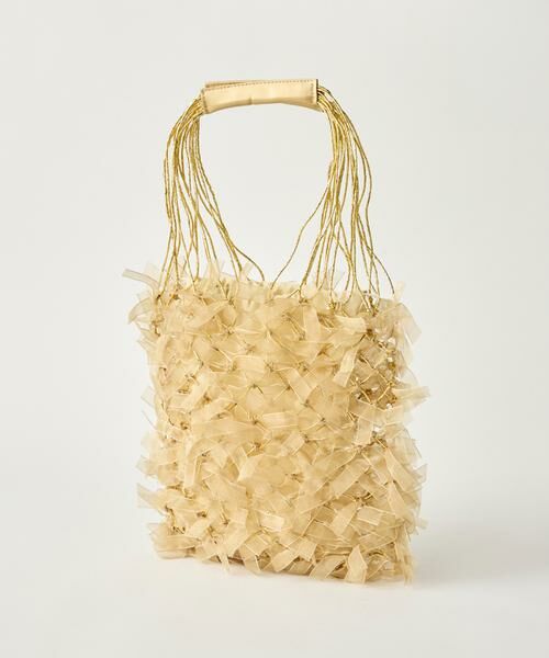 リボン型に結んだチュールが魅力的なデザイン。取り外し可能な巾着付きで、機能性にも優れています。シンプルになりがちな夏のコーディネートに華やかなアクセントを添える、存在感のあるアイテムです。