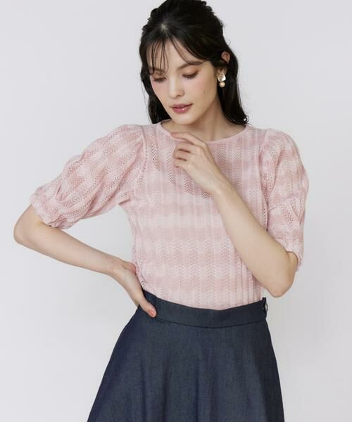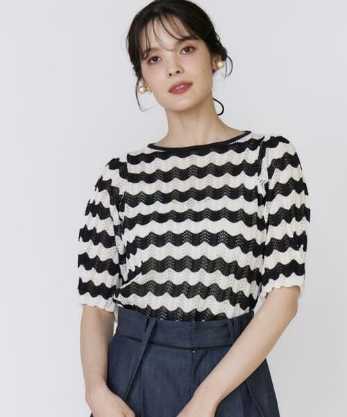 スカラップのような波状のボーダーが目を惹く、透かし柄のニットプルオーバー。大人の品を感じさせるボートネックと、肘まで隠れるふんわりとしたパフスリーブが、上品な印象を引き立てます。軽やかで涼しげな風合いの素材を使用し、夏の長い季節にも快適に過ごせるのが嬉しいポイント。華やかな白×黒のコントラストと、やさしい微配色のピンクの2色展開で、どちらもこだわりのカラーリングです。デニムと合わせればカジュアルに、きれいめスカートと組み合わせればレディライクに。テイストを選ばず着こなせる万能トップスです。