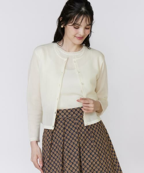 衿元にあしらわれた、透明感のあるファンシーヤーンのレースが目を惹くシアーカーディガン。コンパクトなサイズ感ながら、ほどよいハリ感があり、ジャケットライクなシルエットで一枚でもしっかりと存在感を放ちます。透けすぎない絶妙なシアー感と、さらりと肌離れする着心地の良さが魅力。落ち着いたトーンのカラー展開で、どんなシーンにもなじむ万能さもポイント。お揃いのインナーと合わせれば、アンサンブル風の上品なスタイルに。ワンピースやスカートに羽織ってフェミニンにも着こなせます。