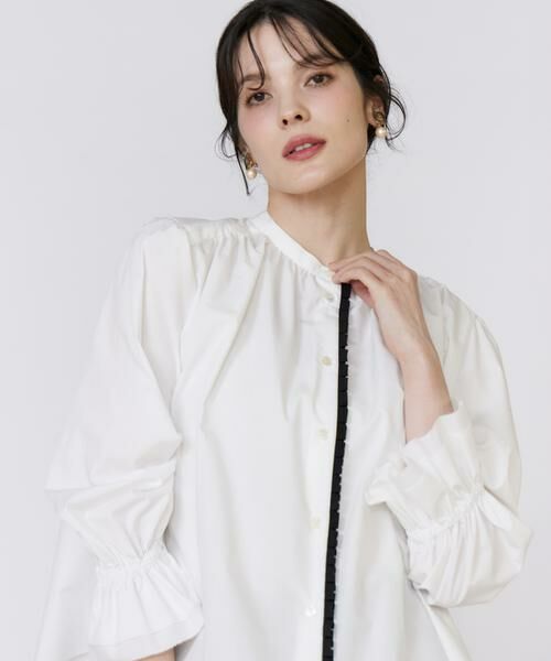 シルエットに動きを持たせた、トレンド感のあるフレアショートブラウス。小さめのスタンドカラーに、前立て端の配色フリルがアクセントとなり、程よくエッジを効かせたデザインが魅力です。衿ぐりと肩にはギャザーを施し、後ろ身頃を長めに設定したことで、立体感のあるフレアシルエットに。袖口はゴムギャザー仕様で、繊細なピコ刺繍をあしらった2段フリルが華やかさを添えています。フロントはトレンドのショート丈なので、今年らしいバランスのこなれたスタイリングができるトップスです。