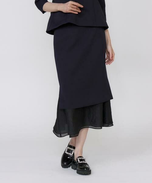 ポワンとした張り感が美しい、構築的なシルエットのセットアップスカート。上質な素材を使用し、丁寧な仕立てでコンパクトながら快適な着心地を叶えています。膝下には、シボ感のある特殊加工を施したオーガンジーを2枚重ねてフレア感を出し、エッジの効いたマーメイドラインに。ヒップまわりはすっきり見えるようシルエットにこだわり、セットアップで着ることでより上品な印象に仕上がります。