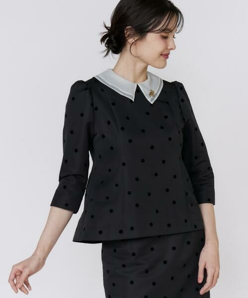 大人気のフロッキードット素材を使用した、構築的なシルエットが美しい衿付きブラウス。上質なグログラン素材で仕立てられ、程よいハリと上品な存在感が魅力です。取り外し可能な衿は、シボ感のあるオーガンジーを2枚重ねた繊細な仕立て。手首が覗く8分袖で、抜け感と上品さを演出します。同素材のスカートとセットアップで着用すれば、より洗練された印象に。