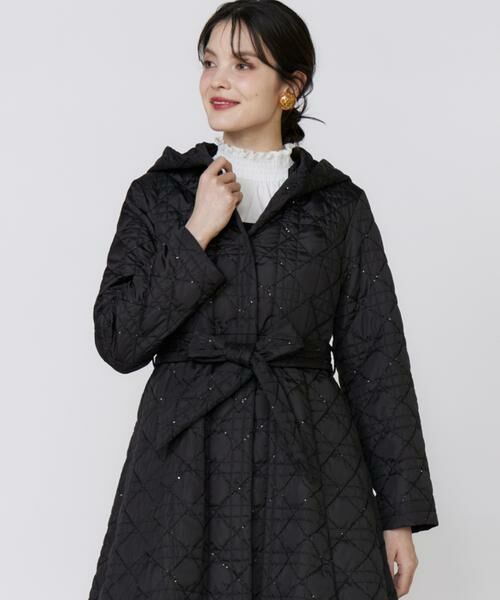 イタリアの歴史あるキルティングメーカーの上質な素材を使用した、ラグジュアリーな印象のフーディーコート。幾何学模様をベースに組み合わせた上品な柄を、柄合わせの難しいキルティングで丁寧に縫製した特別感のある一着です。ベージュはプレーンステッチで上品に、ブラックは一部に特殊なスパンコールステッチを施し、カラーごとに異なる表情が楽しめる別注のオリジナル生地で仕立てました。シルエットは共生地のリボンベルトでウエストをマークし、裾には分量感を持たせることで美しいフィット&フレアを実現。立体的なフードや、第一釦を外した時の衿の返りまで細部にまでこだわり抜いた、特別な一枚です。