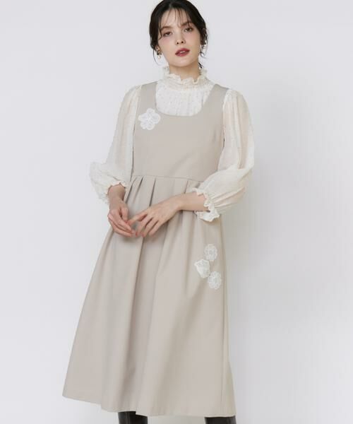 レースを主役にしたクラシカルなフィット&フレアワンピース。手描きから起こした3種類のオリジナル花モチーフは、ヴィンテージレースのような風合いを目指し、ステッチの強弱や立体感にまでこだわった表情豊かなデザインが魅力です。素材はしっかりとした厚みと適度なストレッチ性を持ちつつも軽やかで、着心地の良さと高級感を兼ね備えています。やや広めに開いたネックラインは、インナーを重ねても1枚でも着映えする万能デザイン。共生地ジャケットとのバランスを考慮して、レースの位置にも細やかな調整を加えた、細部までこだわり抜かれた1着です。