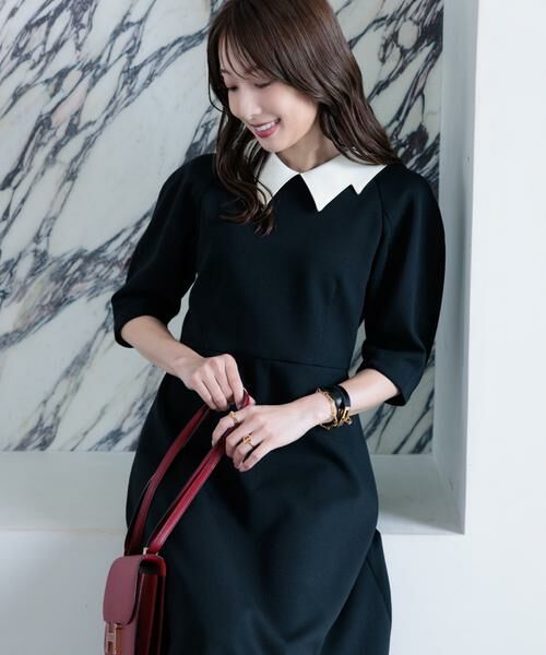 軽さと程よいハリ感が特徴のダンボールニットを使用した、洗練されたシルエットに仕立てた特別なワンピース。スポーティーでマットな黒のボディ生地に、配色の白襟を付けることでエレガントな雰囲気を演出。冨張さんのこだわりが詰まった衿先は、モード感漂う変形デザインでシンプルなシルエットの中に存在感を放ちます。ふんわりとした構築的な肩のデザインがモードな印象に。裾にたっぷりとフレアを入れることで、贅沢で華やかなシルエットに仕上げました。洗練された上品さと旬のムードを併せ持つデザインは、特別なシーンはもちろん、普段のお出かけにもおすすめです。