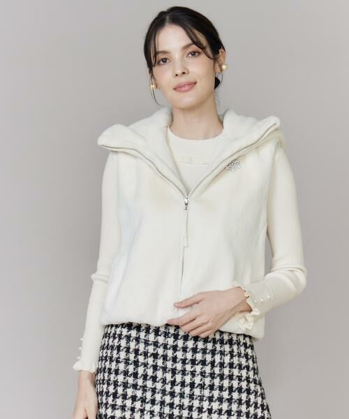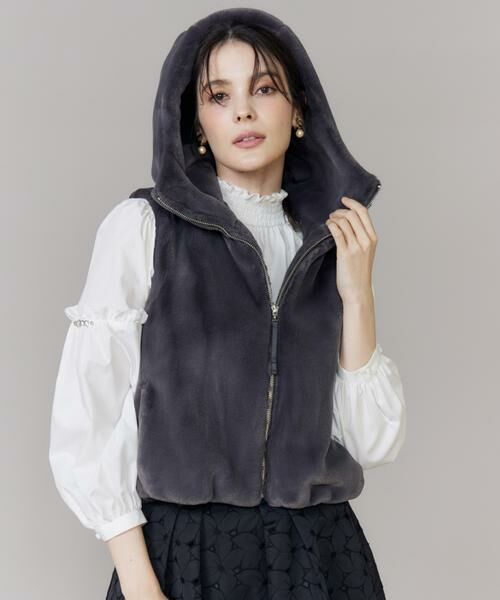 良質で高級感のある滑らかな肌触りのエコファーを使用した、今季のスタイリングに欠かせないファーアイテム。ショート丈のフード付きジレは柔らかな雰囲気を演出し、オフホワイトとチャコールのベーシックな2色展開でご用意しました。フードは立体的なパターンで首元にふんわりと沿い、顎下まで閉められるファスナー付き。コートのインナーとしても活躍し、首元を温めながら快適な温度調整が叶います。内側の裾を絞れる仕様のため、デニムやパンツとも好相性。ワンピースやスカートに合わせれば、旬なスタイリングが完成します。
