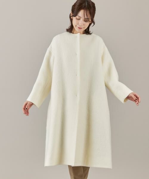 高級なモヘヤループ糸を使い、丁寧にシャギー加工した柔らかく軽さのある完成度の高い素材を使用したテントラインコート。肩のラインを少し落としたデザインで、リラックス感がありながらも洗練された印象を演出します。裾にたっぷりとボリュームを持たせ、高級感を漂わせるマーリエらしい仕上がり。シンプルなクルーネックに、ボタンを見せない仕様を取り入れたことで、洗練された雰囲気に仕上げました。どんなコーディネートにもなじむ汎用性の高い一枚です。ほどよいゆとりを残したリラックス感のあるフォルムに、マーリエらしい上質なデザインが調和し、ワードローブにぜひ加えたいアイテムです。