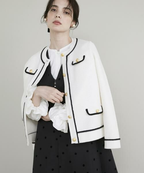 クラシカルなニットジャケットは金ボタンとポケットディテールがポイント。ポコポコとした立体的な編み柄でツイードを表現し、堅苦しさを感じずにきちんと感をプラスできます。ポリエステル糸を使用することでスポンディッシュなハリ感が楽しめ、軽くふんわりとした着心地がデイリーに大活躍。配色が上品なオフホワイトと、モード感のあるレッドの2色展開です。・水洗い可■サンプル撮影商品■こちらの商品はサンプルでの撮影となっております。実際の商品とは、サイズや色味、素材、デザイン等の仕様が若干変更になる場合がございます。