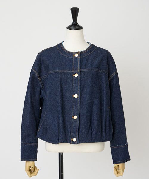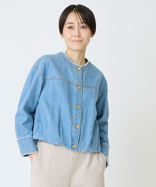 襟元をすっきり見せるノーカラーに裾フロントにはタック、バックはギャザーを入れふくらみのあるフォルム。同素材のジャンスカ合わせがお勧め。女性らしいフレアーラインやワイドボトムもあわせもお勧めです。