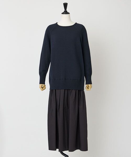 シンプルなプルオーバーにはハリ感のあるタイプライター素材をドッキングさせたワンピース。