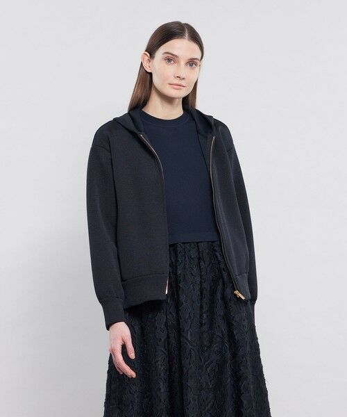 繊細な光沢のある表情がエレガントなニット仕立てのジップアップフーディーです。マットな糸と光沢糸との接結編みでハリ感を出し、立体感のあるフォルムにこだわりました。後ろ身頃の自然なボリューム感が着用時のアクセントになります。程よい肉感、構築的なシルエットが着映え、アウターとしても活躍するアイテムです。接結編みならではの表裏の配色感もポイント。大人に似合う、上品なキレイめパーカーです。