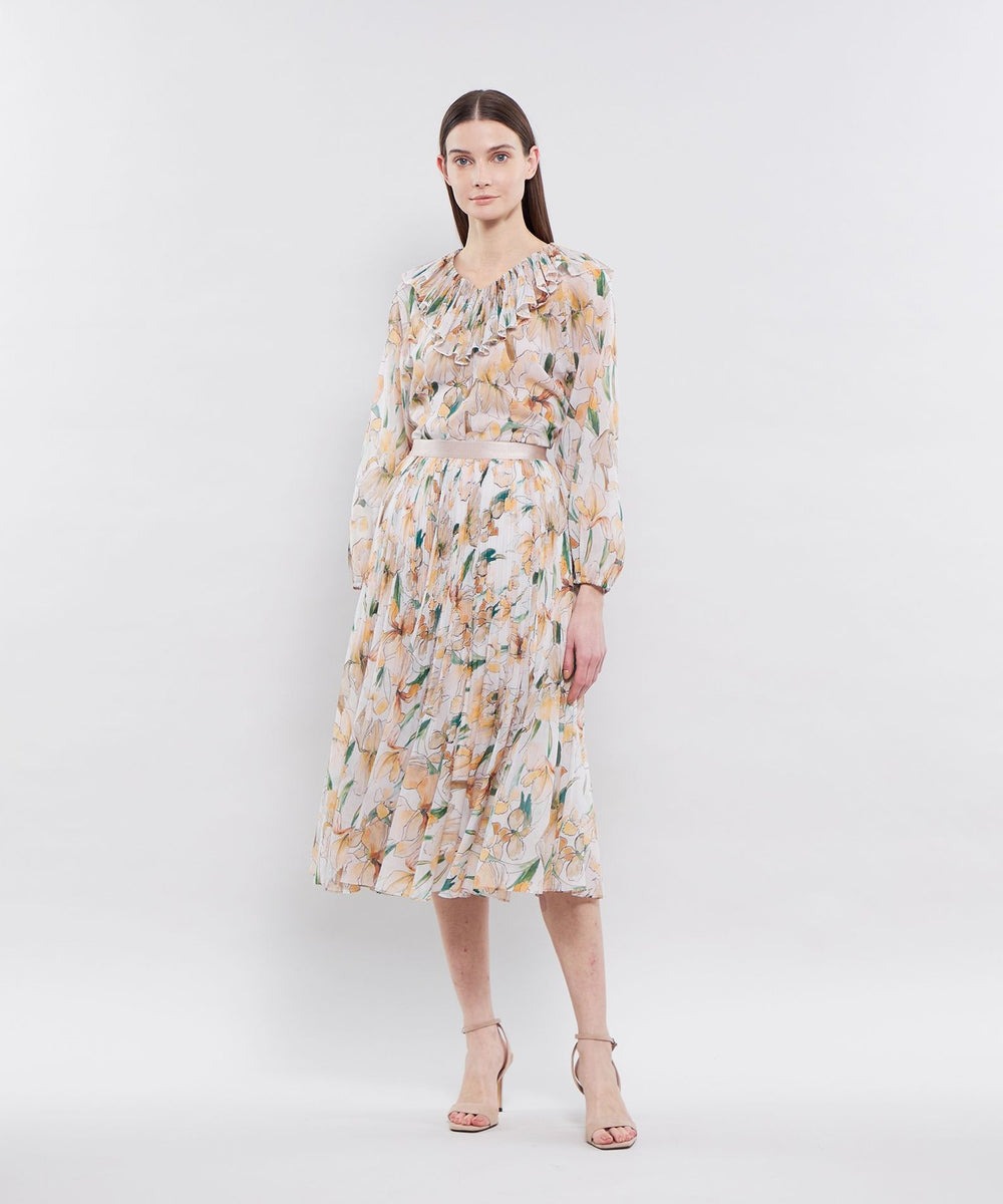 透け感のある薄手のポリエステルボイルに水彩タッチのオリジナルフラワー柄をプリントした素材です。シアーな表情に、繊細なプリントがマッチします。ナチュラルな表情でありながらも、ポリエステル素材なのでシワも気になりにくく、ウォッシャブルにも対応しているイージーケア素材です。