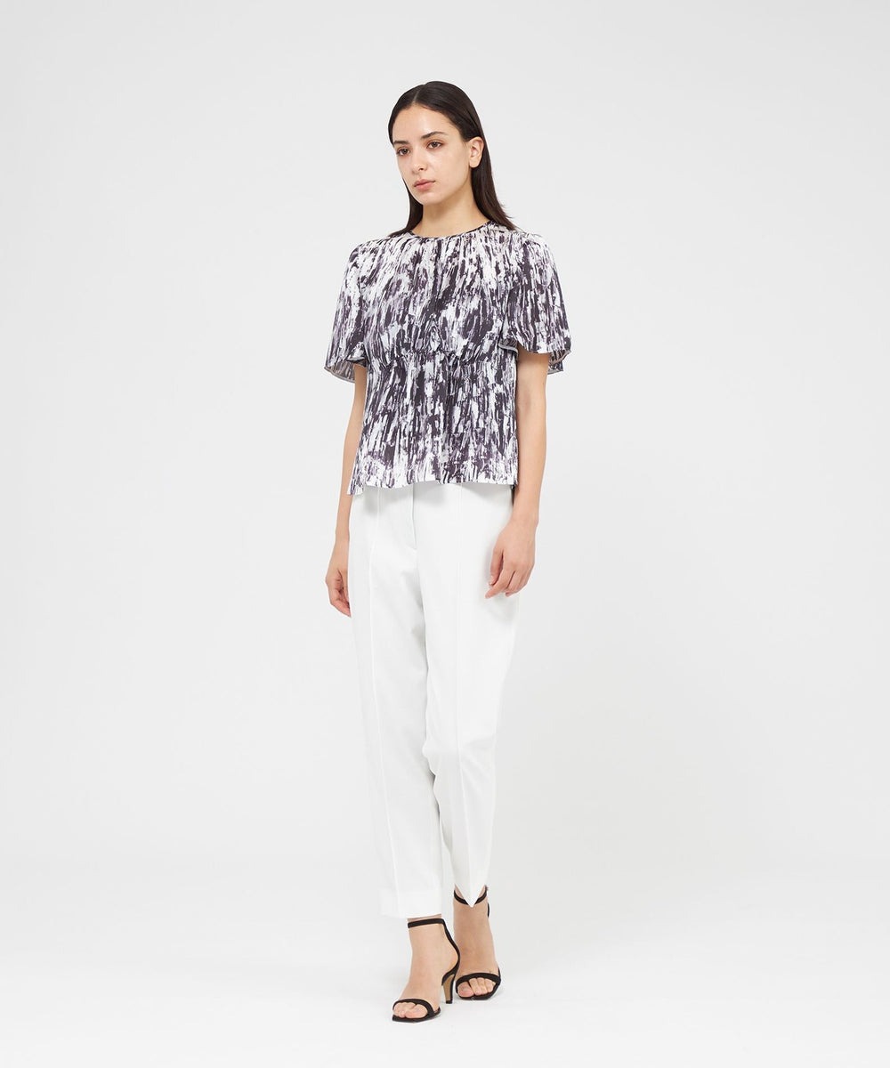 EPOCAオリジナルのシックなアブストラクト柄プリント素材です。 プリントの下地には、タテ糸とヨコ糸の収縮差を利用した表面変化のあるきれいなサテン素材を使用しました。ポリエステル素材なのでシワになりにく、イージーケアが可能な素材です。