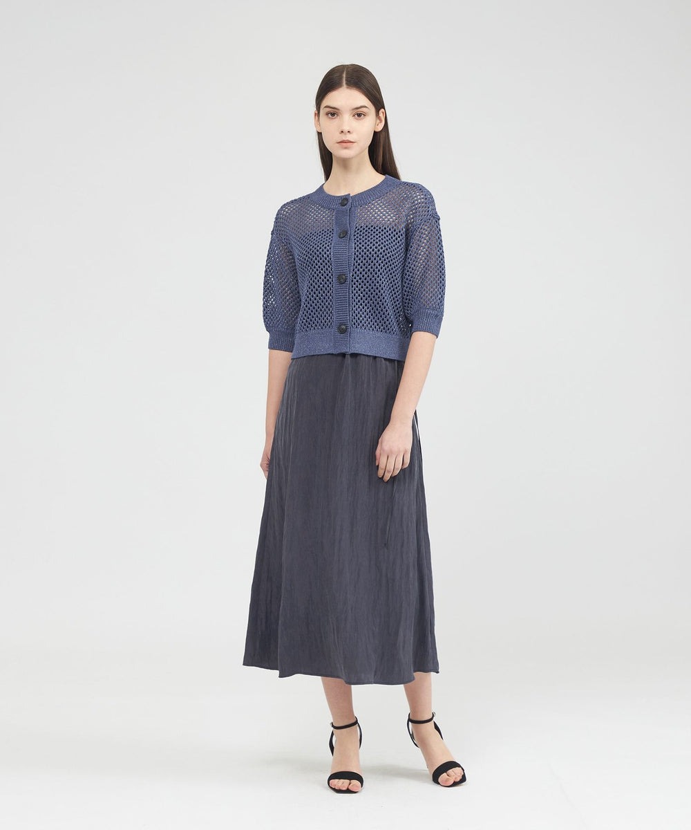微配色見えする艶感のある糸を使用したメッシュ柄カーディガンです。ざっくりとした編み目でありながら、総メッシュ柄に仕上げているので涼し気かつ着用感も非常に軽やかです。