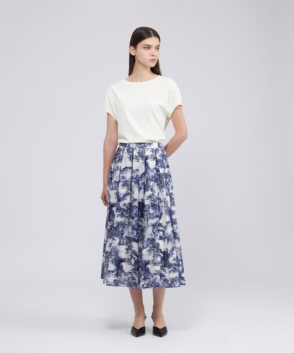 スカートは美しい森の中で自由な生活をする動物たちをEPOCAオリジナルで描いたプリントです。ウエストからふんだんにタックを入れ、裾に向かってボリューム感のあるシルエットに仕上げました。綿平織りならではのソフトな落ち感も相まって軽やかに着用いただけます。ウエストはゴム入り仕様です。