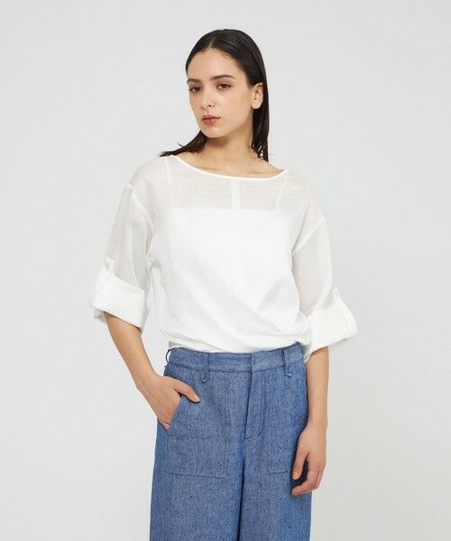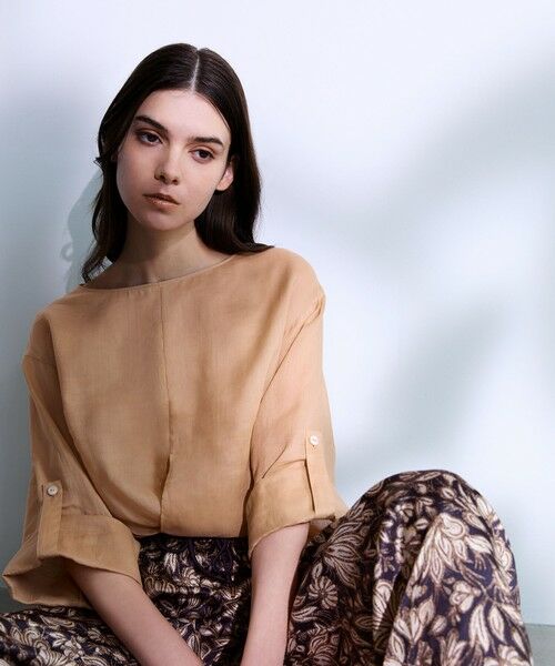 様々な着こなしが可能なマルチWAYブラウスです。裾をクロスし、両脇についている釦を留めればカシュクールを生かしたドレープブラウスになります。前後着用可能で、ドレープのディテールを後ろ側にしても着用いただけます。裾はそのまま垂らして流れるような落ち感を楽しんでいただく着方も可能です。袖はロールアップが出来るタブ付きです。同素材のスカート(品番:M5S31555)とセットアップでも着用いただけます。