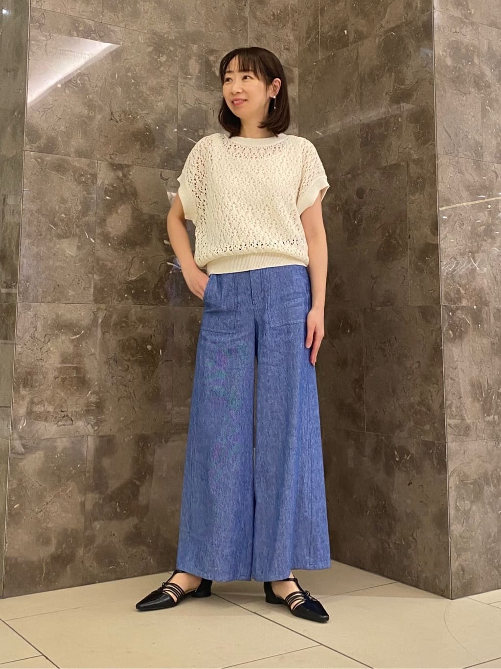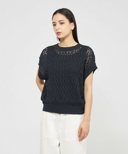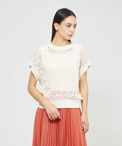 【素材】和紙を原料とし、極めて細くカットした紙糸にポリエステルを交燃させたハイブリッドペーパーヤーンです。紙が持つ軽さ、通気性、さらりとしたドライタッチが特徴の暑い季節にぴったりな清涼感のあるニット素材です。【デザイン】本取りを変えて表現したレースのような透かし柄のニットプルオーバー。ややオーバーなニュアンスシルエットが雰囲気のある着こなしを叶えます。インナーキャミソール付きです。和紙ならではの軽さと、透かし柄の清涼感がポイントの爽やかな1着です。同素材のスカート(品番:M5S32557)とセットアップでも着用いただけます。ご自宅で手洗い可能です。洗濯表示に従ってお手入れしてください。透け感:あり(インナー付き)伸縮性:あり生地の厚さ:普通おすすめ着用期間:春、夏※この商品はサンプルでの撮影を行っています。実際の商品とイメージ、仕様が異なる場合がございます。