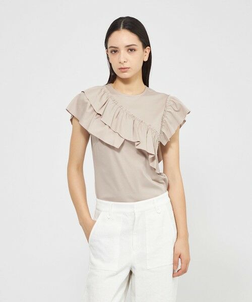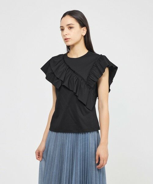 ラッフルをふんだんに取り入れた、着映えするデザインカットソーです。ラッフルはアシンメトリーデザインにすることで甘すぎない雰囲気に仕上げました。カットソーの着心地はそのままにブラウス感覚で着用いただけます。パンツ、スカート合わせともにコーディネートに華やぎを加えてくれるアイテムです。